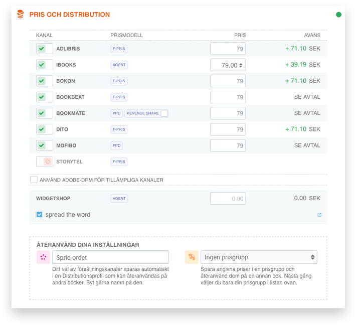 Prissättning och distribution i ny gestaltning: Med en helt ny design av Pris och distribution har det blivit ännu enklare att bestämma var du ska sälja dina böcker och till vilket pris. Med några få klick rör du dig snabbt över hela världen och den växande floran av återförsäljare.