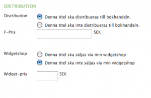 Funktionen för att sätta en titels F-pris har flyttat till ett eget kort, där det också blir möjligt att avgöra huruvida titeln ska vara tillgänglig i widgetshopen. Så har vi gjort eftersom vi redan nu ser att vi kommer erbjuda fler och fler olika distributionskanaler framöver, för både POD och, framför allt, för e-böcker. När vi senare i vår lanserar stöd för att hantera e-böcker i systemet kommer motsvarande kort styra om dina titlar ska bli tillgängliga via E-lib, via iTunes store eller via widget shopen.